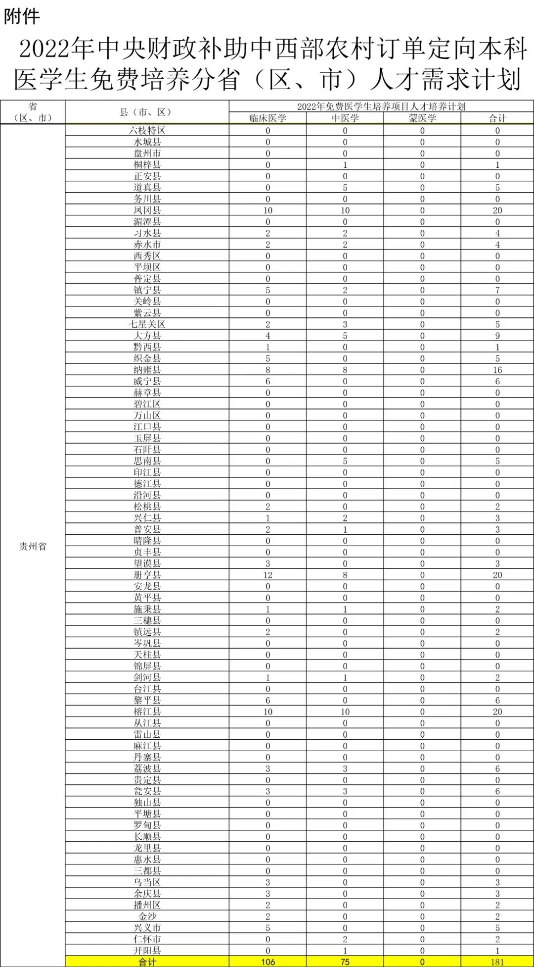 贵州招181人 2022年中央财政支持中西部农村订单定向免费本科医学生招生