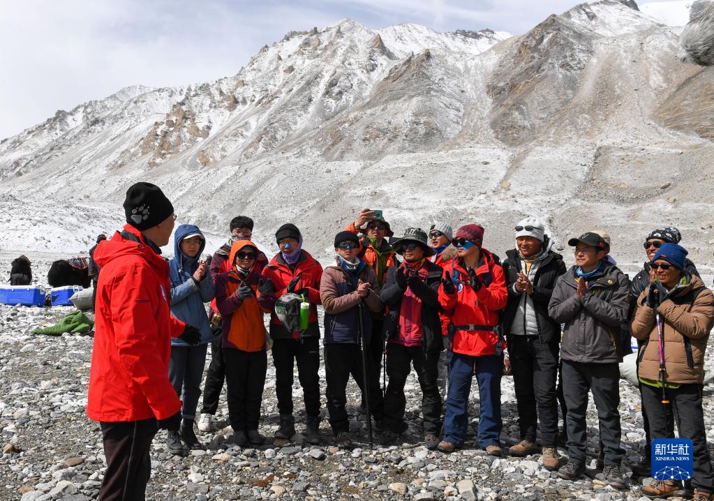 在珠峰登山大本营,冰川与污染物科考小组负责人康世昌(左一)在做行前动员(5月1日摄)。新华社记者 姜帆 摄