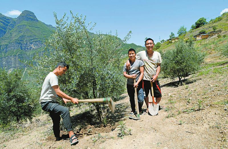 2022 从“悬崖村”建档立卡贫困户搬迁下山时起,7位村民便时常留在山上,经营和管理山上的205亩油橄榄、200多只山羊和民宿。2022年5月10日,留在山上的村民在为油橄榄树松土、除草。在他们的养护下,6000余株油橄榄都长势喜人。