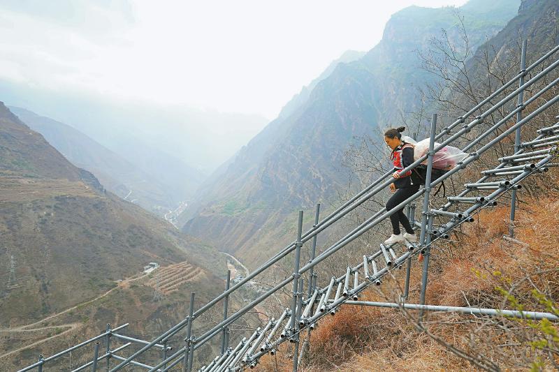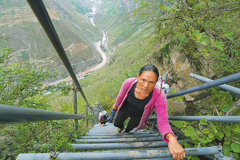20192019年5月28日,吉莫石普在攀爬钢梯,为家里运生活物资,身后的丈夫某色拉比是在“悬崖村”酿玉米酒的第一人。