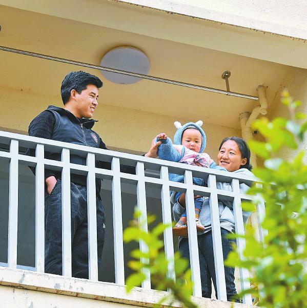 20222022年5月9日,惹记伍果(右)抱着1岁零5个月大的女儿莫色伍之和丈夫莫色布洛在新家的阳台上晒太阳。莫色伍之出生于2020年12月11日,是“悬崖村”搬迁后村里出生的第一个新生儿。