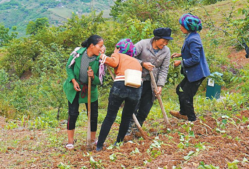 20192019年5月28日,“悬崖村”的阿火阿果,背着孩子和村民在一起干农活。