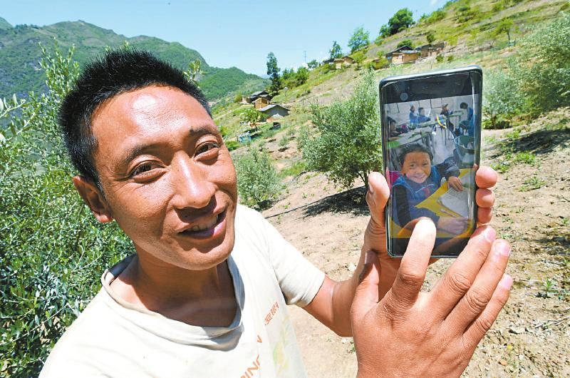 莫色惹地的爸爸莫色日者眼下正在“悬崖村”的山上管理油橄榄树。“这是我女儿!”5月9日中午,他看到记者拍摄莫色惹地在特校学习的照片,很是幸福。