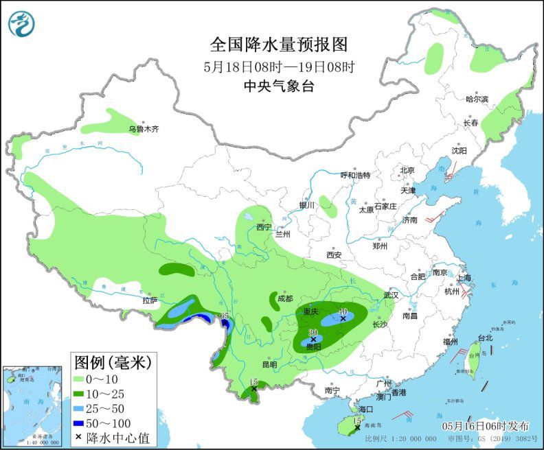 5月18日08时至19日08时,贵州大部、重庆南部、湖南西部、云南南部和西部、海南岛东南部、西藏东南部等地部分地区有中到大雨,其中,西藏东南部、云南西北部等地部分地区有暴雨(50~65毫米)。黄淮东部、辽东半岛等地部分地区有4~5级风。