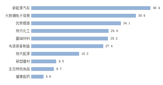 十大工业产业营业收入分别为:现代能源实现营业收入793.87亿元、优质烟酒实现营业收入537.50亿元、大数据电子信息实现营业收入436.65亿元、基础材料实现营业收入399.81亿元、现代化工实现营业收入385.81亿元、先进装备制造实现营业收入332.24亿元、新型建材实现营业收入318.93亿元、生态特色食品实现营业收入209.10亿元、健康医药实现营业收入198.64亿元、新能源汽车实现营业收入166.41亿元。