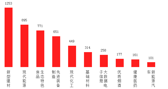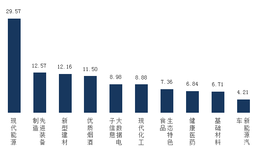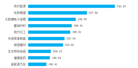 其中,现代能源总产值为908.18亿元、优质烟酒总产值为555.19亿元、大数据电子信息总产值为483.60亿元、基础材料总产值为466.50亿元、现代化工总产值为415.67亿元、生态特色食品总产值为400.54亿元、先进装备制造总产值为391.73亿元、新型建材总产值为383.63亿元、健康医药总产值为251.46亿元、新能源汽车总产值为184.08亿元。