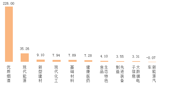 十大工业产业中优质烟酒产业尤为突出,上缴税金226亿元,占十大工业产业税金总额的74.3%,现代能源、新型建材、现代化工、基础材料、健康医药、生态特色食品、先进装备制造、大数据电子信息、新能源汽车9个产业合计上缴税金43.10亿元,占十大工业产业税金总额的25.7%。