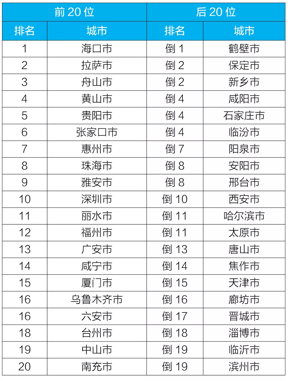 川观新闻记者梳理发现,4月,在全国168个重点城市中,海口、拉萨和舟山等20个城市空气质量相对较好(从第1名至第20名);鹤壁、保定和新乡等20个城市空气质量相对较差(从倒数第1名至并列倒数第19名)。