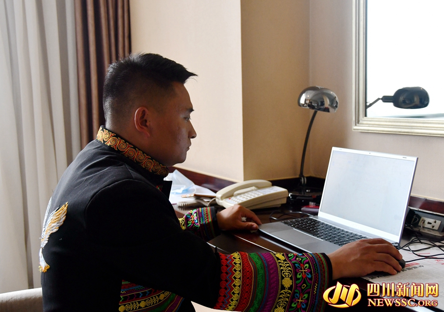 省第十二次党代会代表、汉源县永利彝族乡古路村党支部书记、村委会主任郑望春正在使用电脑办公