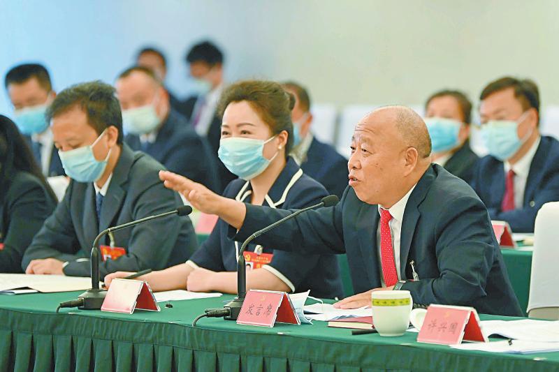 高德敏代表(右一)建议,继续推动生态价值转化,促进产业融合发展,大力培养农业职业经理人队伍。 记者 杨树 摄