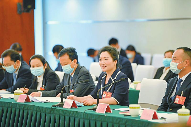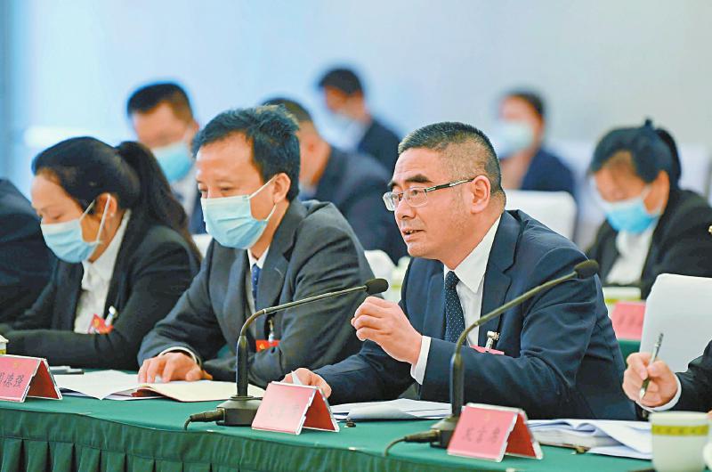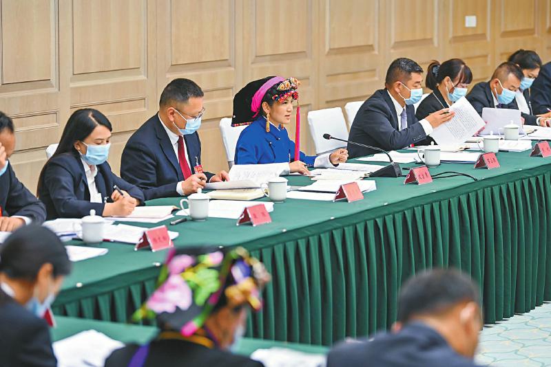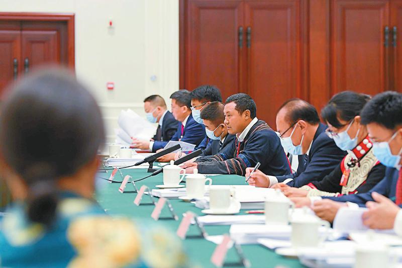 来自凉山州昭觉县三岔河镇三河村的洛古有格代表(右四)说:“继续努力带领家乡群众共同致富,把富民产业发展好,把脱贫攻坚成果巩固好,把家园建设好。”