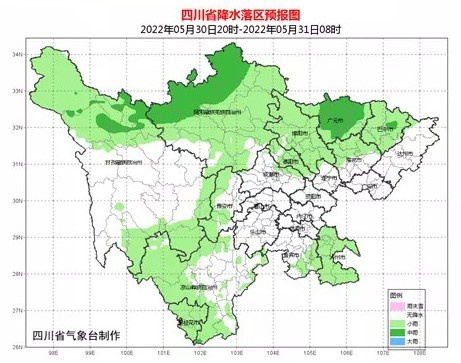 今天(5月30日)晚上,广元、绵阳、德阳、雅安、巴中、南充、宜宾、泸州8市多云转阴,部分地方有阵雨或雷雨,其中广元市有中雨,盆地其余地方多云间晴。川西高原和攀西地区阴天间多云有阵雨或雷雨,其中甘孜州西北部和阿坝州西北部有中雨。
