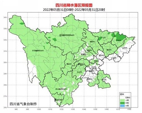 明天(5月31日)白天,达州、广安2市多云,盆地其余地方阴天间多云有阵雨或雷雨,其中巴中市有中雨。川西高原和攀西地区阴天间多云有阵雨或雷雨。