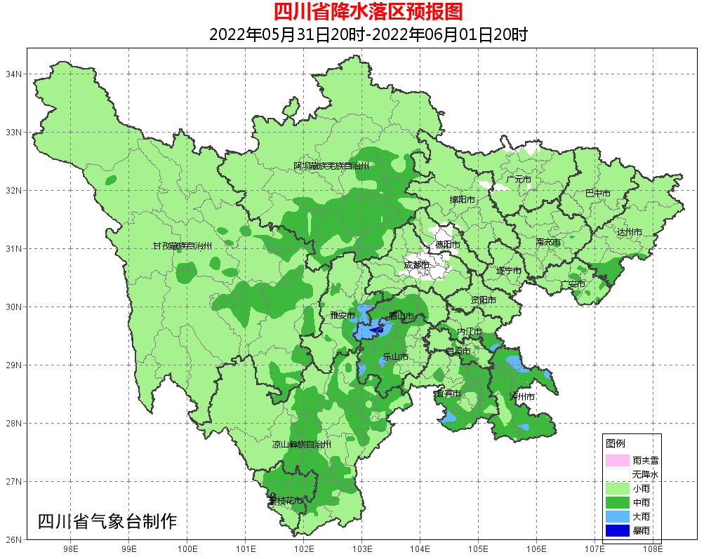 5月31日晚上到6月1日白天,盆地各市阴天间多云有阵雨或雷雨,其中雅安、眉山、乐山、内江、自贡、宜宾、泸州7市及达州市南部的部分地方有中雨,局部大雨;川西高原和攀西地区阴天间多云有阵雨或雷雨,其中阿坝州东部、甘孜州南部及攀西地区的部分地方有中雨。