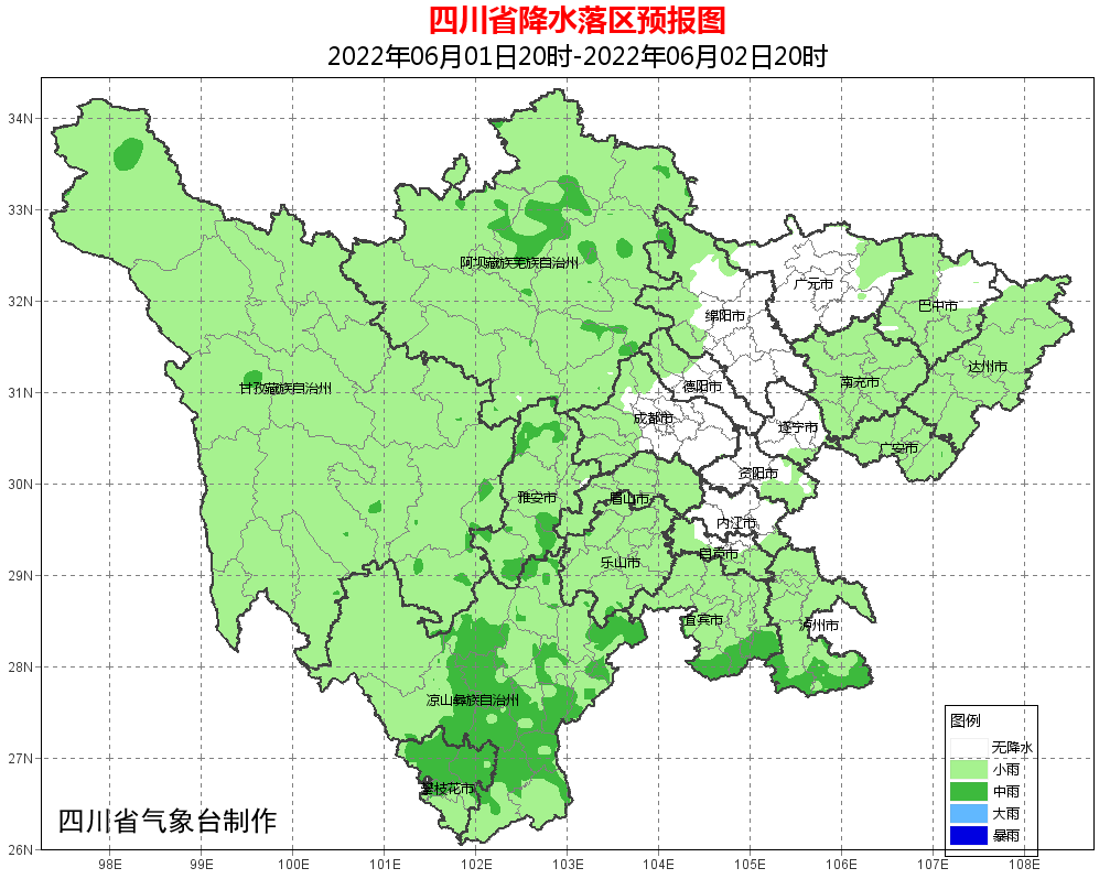 6月1日晚上到6月2日白天,盆地各市阴天间多云,部分地方有阵雨或雷雨,其中宜宾、泸州2市南部的局部地方有中雨;川西高原和攀西地区阴天间多云有阵雨或雷雨,其中阿坝州中部及攀西地区的局部地方有中雨。