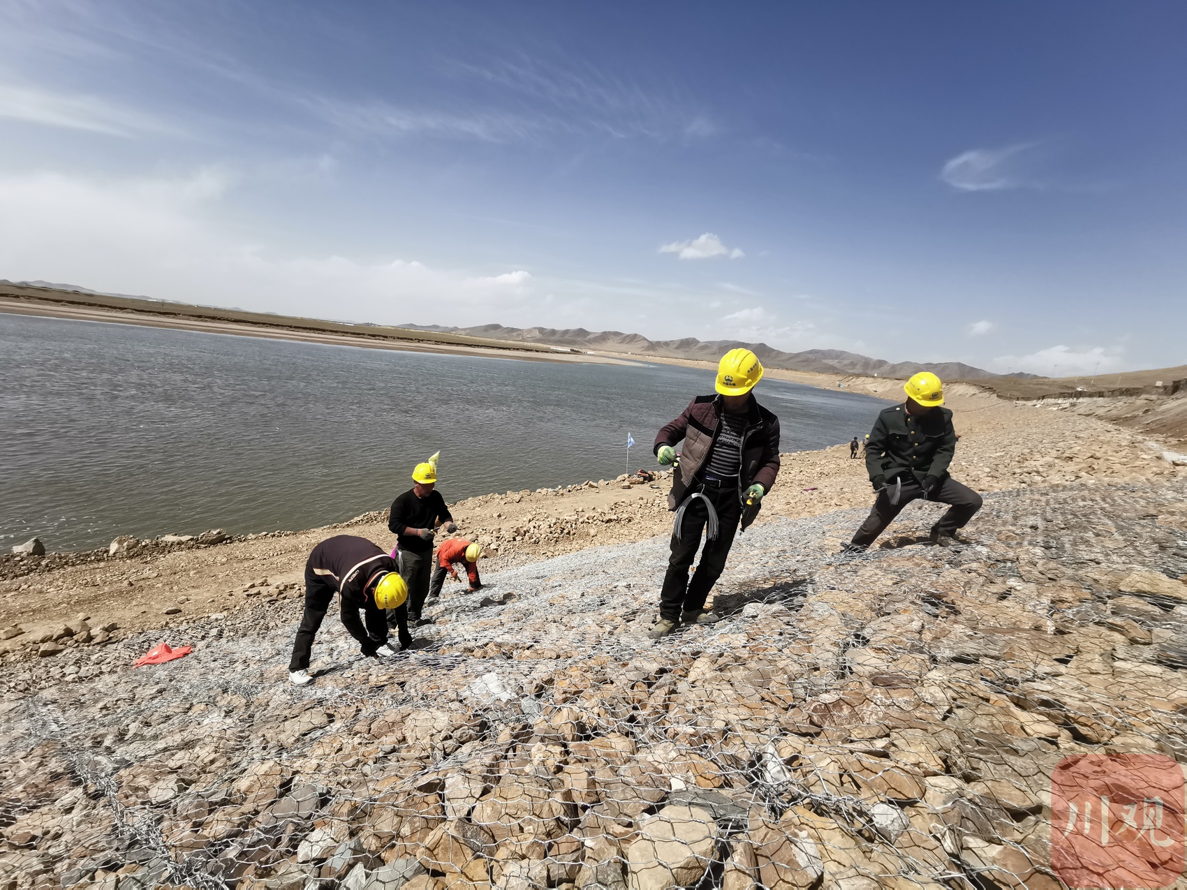 川西北高原乍暖还寒,天气说变就变——清晨还飘着雨夹雪,中午就已是艳阳天。5月27日,在阿坝州若尔盖县唐克镇和辖曼镇交界处的黄河干流若尔盖段应急处置工程施工现场,几十名工人正在黄河堤岸上编制格宾网石笼。