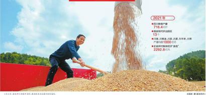我省实施粮食安全党政同责考核,落实“长牙齿”的耕地保护硬措施,对未能完成粮食生产目标任务的,一票否决涉农工作考评和表彰。一手抓肥料等农资保供稳价,一手落实好各项惠农政策,今年全省种粮大户补贴标准继续保持在80元/亩,保证种粮有合理收益。水稻育种取得突破性成效,近年来以“宜香优2115”“川优6203”等为代表的新品种,改写了“蜀中无好米”的历史。2020年全省粮食产量达705.4亿斤,时隔20年再次迈上700亿斤台阶;2021年全省粮食产量达716.4亿斤,再创新高。