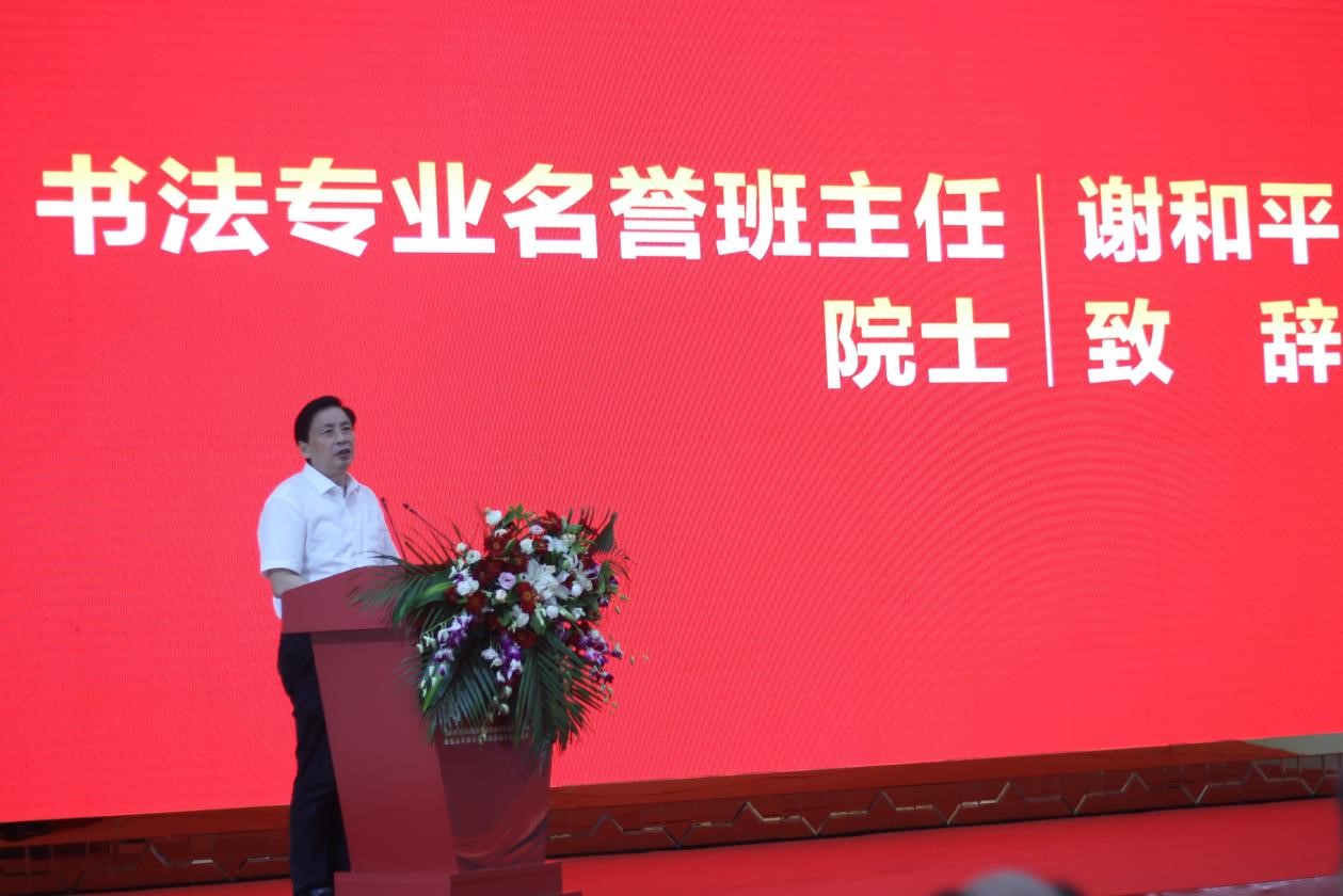 谢和平院士介绍,本届学生毕业展是在为迎接中国共产党第二十次全国代表大会胜利召开,同学们对时代的感恩与献礼。在同学们即将毕业,走向社会开启新的人生时刻之际,谢和平院士为书法专业老师同学带来勉励。他说,书以载道,学养人生。将书法置身中国整体文化视域进行阐释,可以反映中国传统文化整体视野的多维视角。我们通过对书法技法学习,可以理解书法之法与传统文化涵养与修炼之法,也是做人之法。此外,做人和做学问,都要讲毅力。没有坚韧不拔的精神,很难成功。
