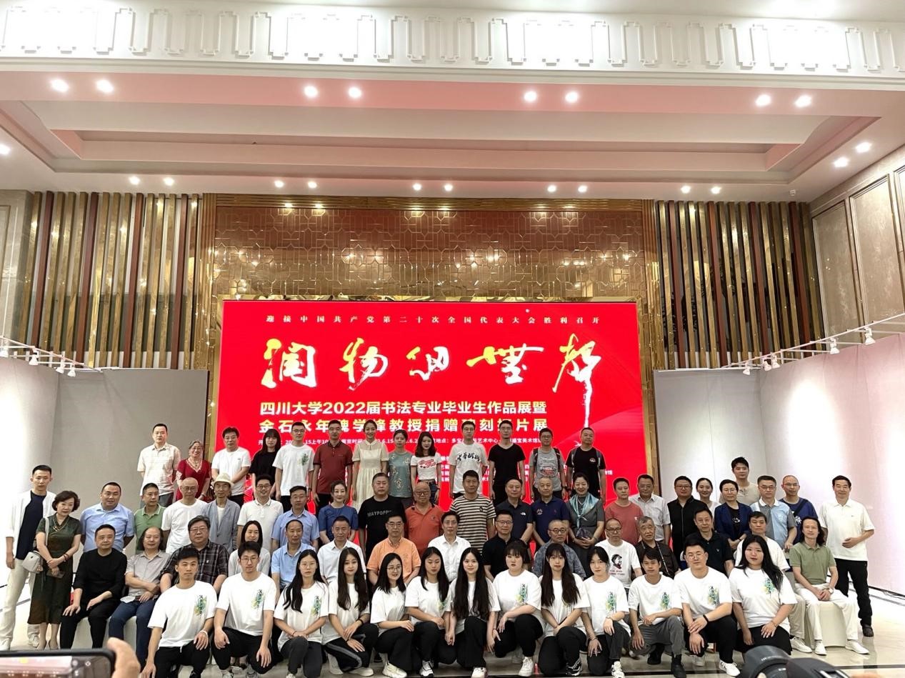 展览现场,展出了本科毕业生作品与硕士毕业生作品,篆、隶、楷、行、草、篆刻作品类别齐全,既有巨幅大字、也有手卷简札,形式丰富,题材多样。此外,魏学峰教授以对母校的情怀和感恩,为四川大学艺术学院捐赠汉代和北魏碑刻原拓60余幅。四川大学艺术学院院长何宇教授为魏学峰教授颁发四川大学收藏证书。