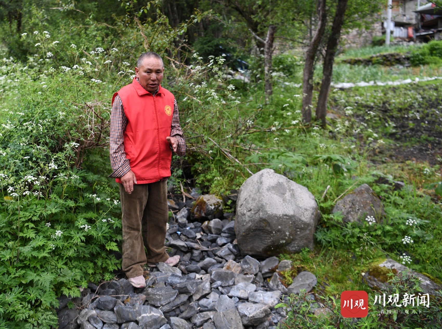 6月9日20时51分,草登乡发生地震后,科拉机村一组组长、地灾监测员然拉木滚,发现房屋周边一条从未断流的小溪断流了,根据培训知识判断接下来可能会发生较大地质灾害,及时组织村民转移、避免12人因灾伤亡。图为然拉木滚和断流的小溪。