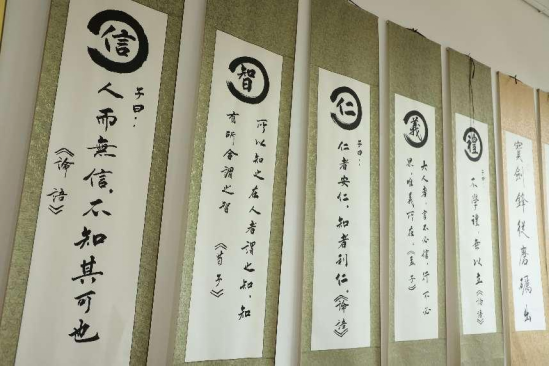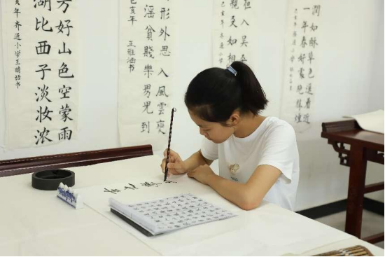 书画作为中华优秀传统文化的一个重要内容,承载着传统文化的道德理念、审美价值、人文精神。走进齐通小学,教室墙壁、楼间走廊都洋溢着非常浓烈的传统书画气息。“我们非常重视传统文化的氛围营造,坚持以美辅德、以美益智,让学生们从小学习中国书画,培养孩子们从小热爱传统文化,从而发扬传统文化。”齐通小学美术教师刘娟介绍说。