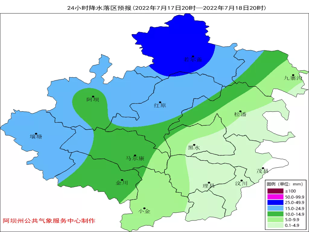阿坝州气象台预计,7月18日中午到晚上,阿坝自西向东有一次明显降水天气过程。全州多云转阴天有中雨,北部(阿坝县、壤塘县、红原县、若尔盖县、九寨沟县)、中部(马尔康市)、西南部(金川县、小金县)部分乡镇有大雨到暴雨,全州最高气温将下降2~6摄氏度。过程期间将伴有雷暴大风、短时强降水、冰雹等强对流天气,请各相关部门注意防范强降雨可能引发的山洪、泥石流等次生灾害的发生。记者 陈婷
