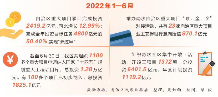 自治区重大项目累计完成投资2419.2亿元,同比增长12.99%;完成全年投资目标任务4800亿元的50.40%,实现“双过半”
