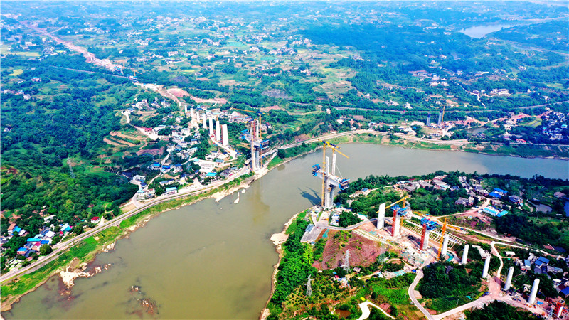 中铁四局渝昆高铁川渝段一分部项目经理葛艳庆介绍,从2021年初进场,主塔施工区域地质条件较为复杂,岩层成孔难、场地狭窄、施工难度很大,工期紧张,同时两大主塔跨越沱江珍稀鱼类保护区,位于两岸河滩处,不仅景观要求高,而且必须要抢在汛期前完成钻孔桩、承台施工。为确保该桥按节点目标推进,项目部通过优化方案、超前谋划、加大资源配置、加快工序衔接、强化考核力度,突破传统“先桩基、后承台”的施工方法,采用“基坑开挖前置”、“干挖二次成孔”工艺,在汛期到来前,顺利完成主墩出水,比正常施工提前工期3个月。此后,项目部针对主桥施工始终坚持“技术攻关提前筹划、资源配置充分倾斜、施工组织超前推进、安全质量有序把控”的原则,确保各项进度节点任务稳步推进。今年春节后,更是相继完成0号块浇筑、连续梁跨江施工、索鞍定位安装等重要节点,为主塔顺利封顶奠定了坚实基础。