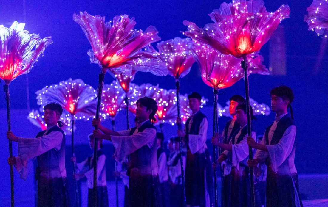 展演巧用“花朵”“江河”“山峦”“梦想”四重元素。“‘花朵’喻人,‘江河’喻魂,‘山峦’演绎拼搏,鼓声奏响‘梦想’。”开幕式总导演白晓旭表示,四重元素层层递进,由“人”到“精神”,再到“梦想”,构建起一幅多彩绚烂的大美天府画卷,反映出9100万巴蜀儿女共筑体育强省梦、伟大中国梦的精气神。