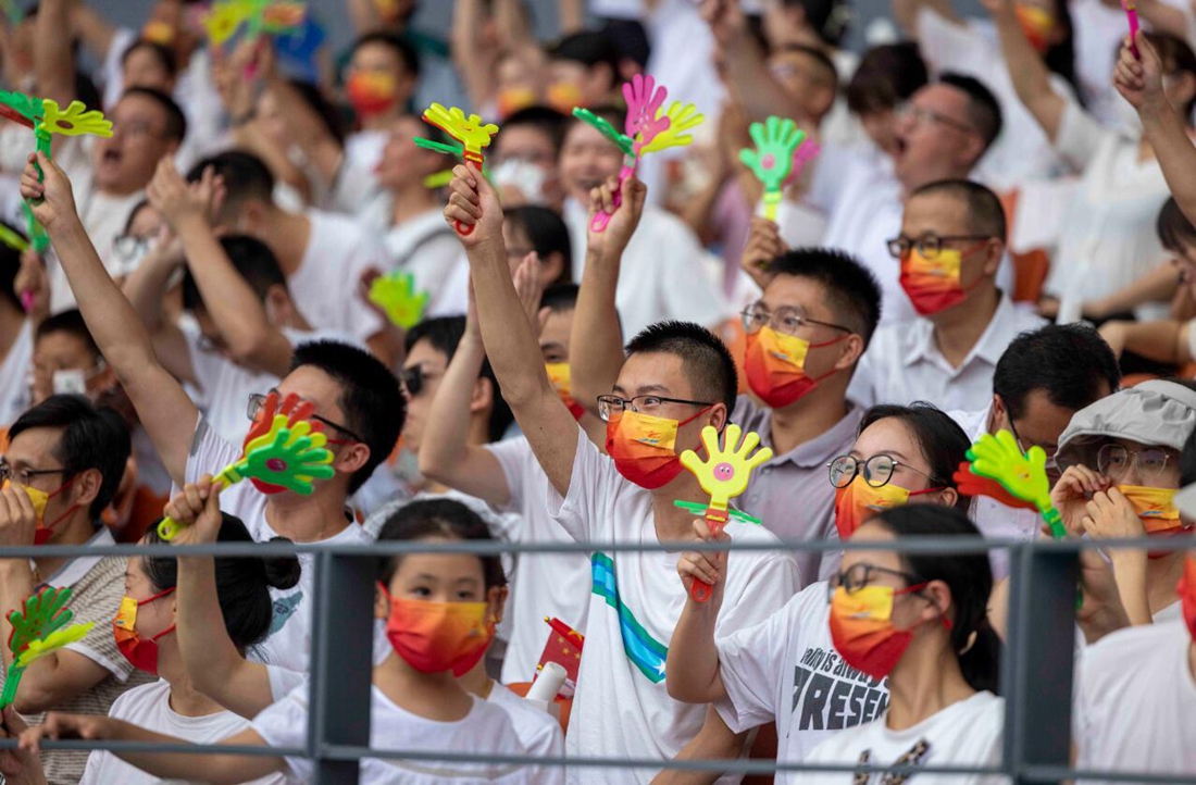 随着三声沉稳钟声敲响,开幕式暖场表演《天府乐》开始。在雷动的掌声中,650名舞者踩着动感的旋律,手持篮球、滑板、羽毛球拍等道具,从会场四周奔向舞台中央。他们身后,“川”字形巨幕画面转换,东道主的蓬勃发展之姿在大屏幕依次呈现;脚下,全息投影编织画卷,映衬出一幅“体育嘉年华”的绝妙光景。