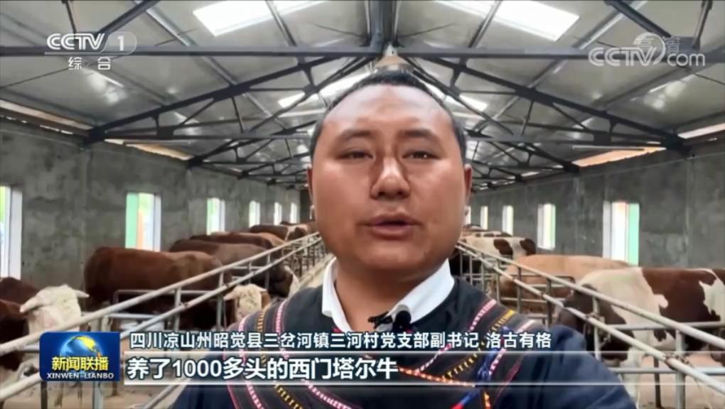 四川凉山州昭觉县三岔河镇三合村党支部副书记 洛古有格:我现在带领全村老百姓,养1000多头的西门塔尔牛,(每年)人均收入达到了13000多(元)。