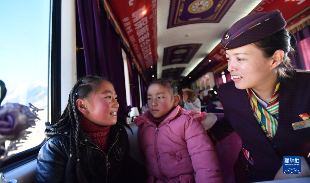 青藏铁路拉萨至日喀则段的藏族女列车长贡久曲珍(右)与乘客聊天(2020年1月12日摄)。新华社记者 觉果 摄