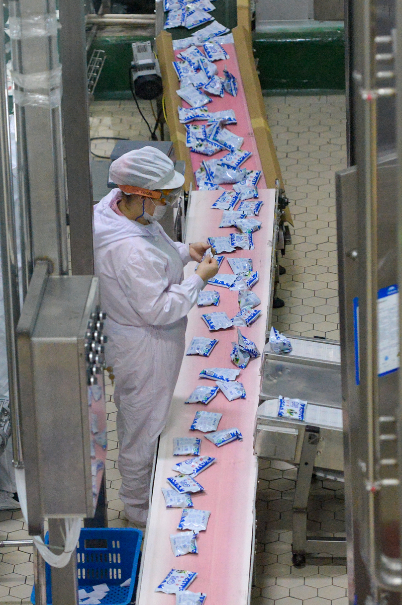 新疆天润乳业股份有限公司的工作人员在生产线上忙碌(2020年3月1日摄)。新华社记者 丁磊 摄