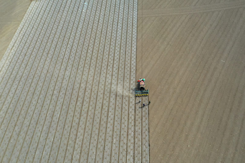 在新疆生产建设兵团第六师共青团农场的棉田里,职工操作搭载北斗导航系统的播种机进行春播(2022年4月19日摄,无人机照片)。新华社记者 丁磊 摄