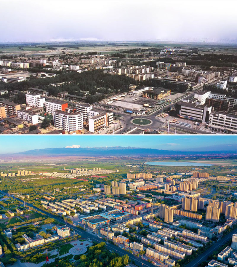 拼版照片:上图为2000年拍摄的新疆生产建设兵团农六师五家渠市(资料照片);下图为2020年7月26日无人机拍摄的新疆生产建设兵团第六师五家渠市(李华北摄)。新华社发