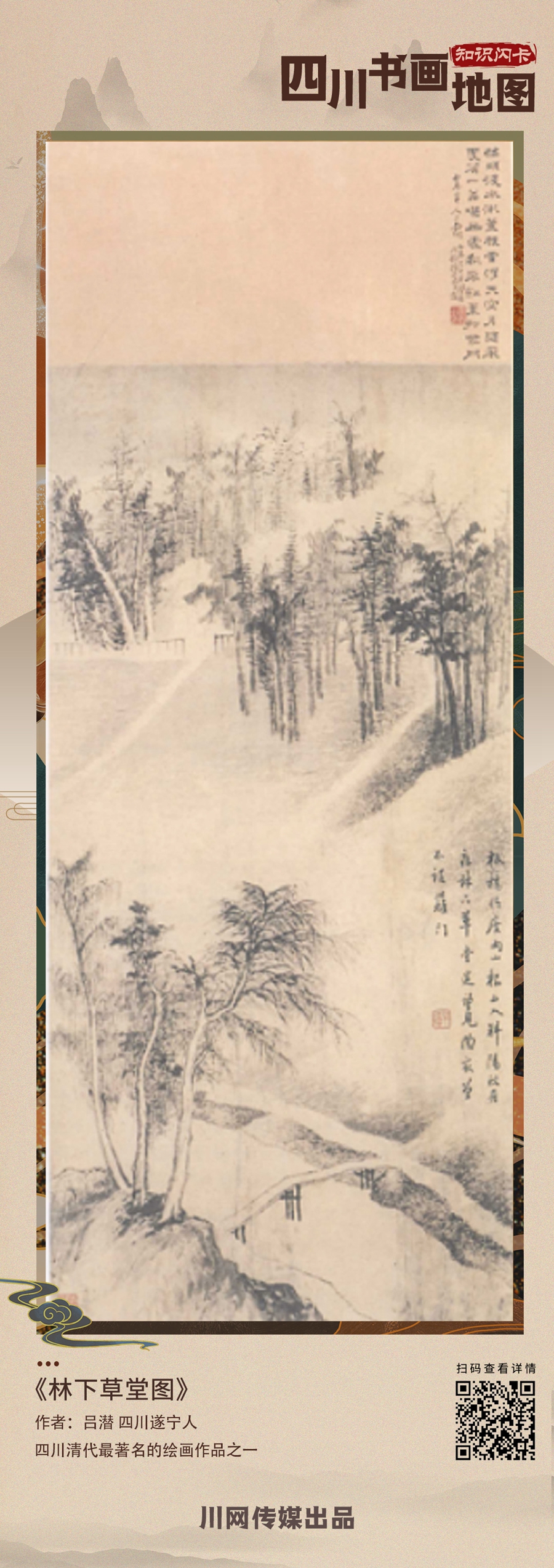 吕潜《林下草堂图》轴,纸本,墨笔,纵85厘米,横41.4厘米。现藏北京故宫博物院。此画列入林树中主编《美术辞林》(中国绘画卷·上卷)的“作品赏析”,是其介绍的117幅清代绘画作品(含壁画)之一,四川仅此一幅列入,同时,《收藏辞典》也专门介绍了此画,因此可说此画应为四川清代最著名的绘画作品之一。