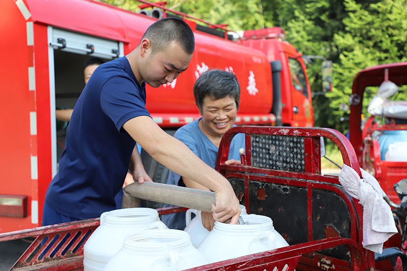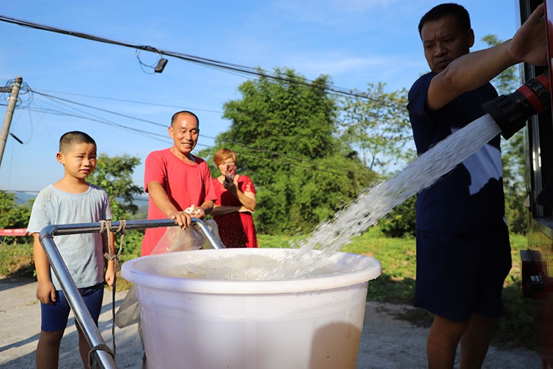 护国镇消防救援站指战员为前来接水的群众装水。邓建刚摄