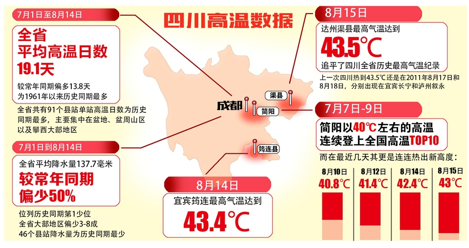 据了解,8月14日,宜宾筠连最高气温达到43.4℃,为今年7月以来全省最高;8月15日,这一数据很快被刷新,达州渠县最高气温达到了43.5℃,追平了四川全省历史最高气温纪录。