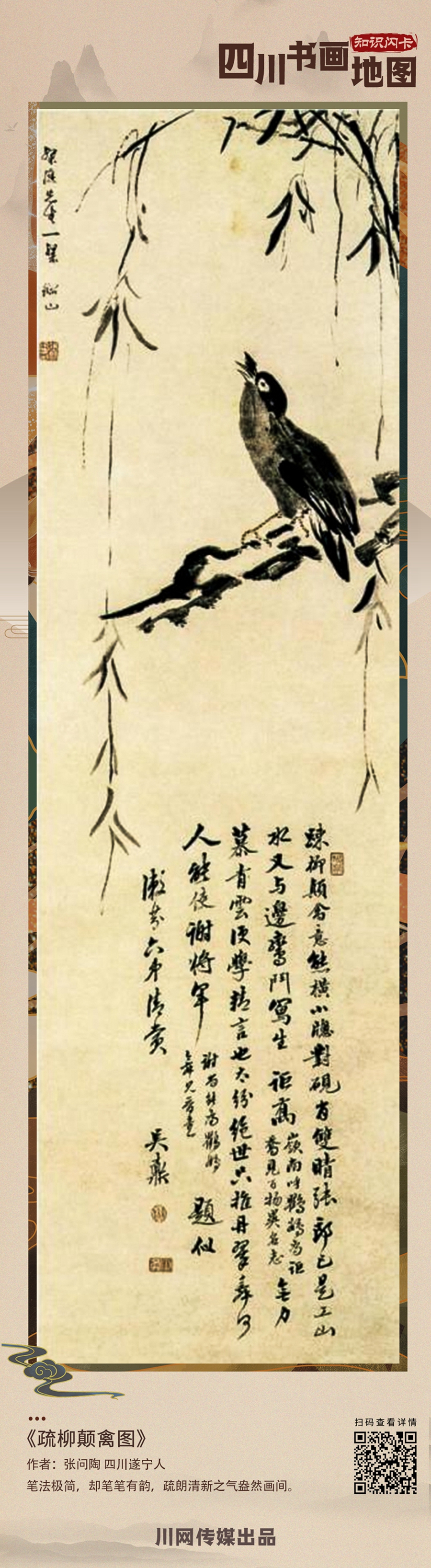 张问陶的《疏柳颠禽图》是他的花鸟画代表作品。“此画写一鸦立于柳树的一节枯枝之上,正向天呜叫。背后几枝稀疏的柳条,信手写来,细笔欲断,似漫不经心,却意韵悠长。淡墨写鸦,浓墨点提首冠尾羽。笔法极简,却笔笔有韵,疏朗清新之气盎然画间。”唐林说道。