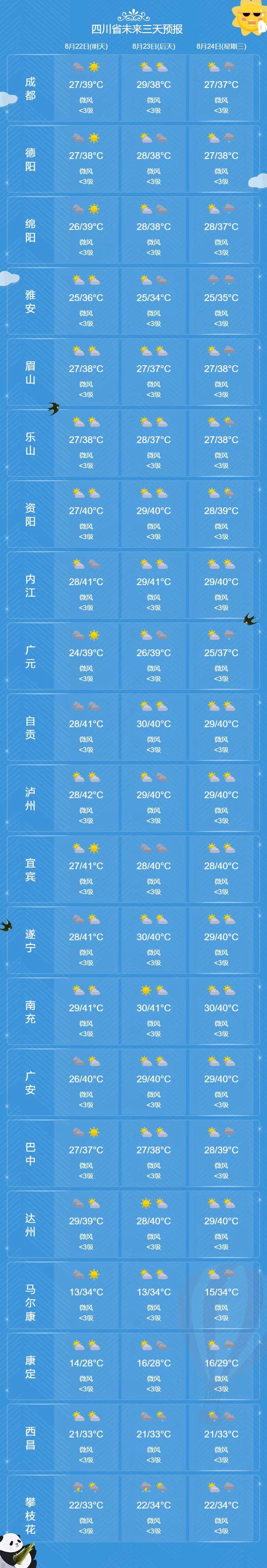 24小时内,盆地最低气温:盆周山区23~26℃,其余地方27~30℃;最高气温:西部沿山36~39℃,其余地方40~43℃。