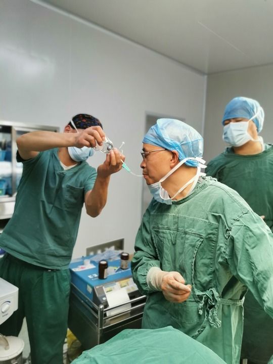 2021年12月24日,重庆医科大学附属第一医院胸心外科副主任、医疗人才“组团式”援藏重庆医疗队队长蒋迎九(前)半夜急诊,长时间手术术中采用特殊方式饮水解渴。新华社发