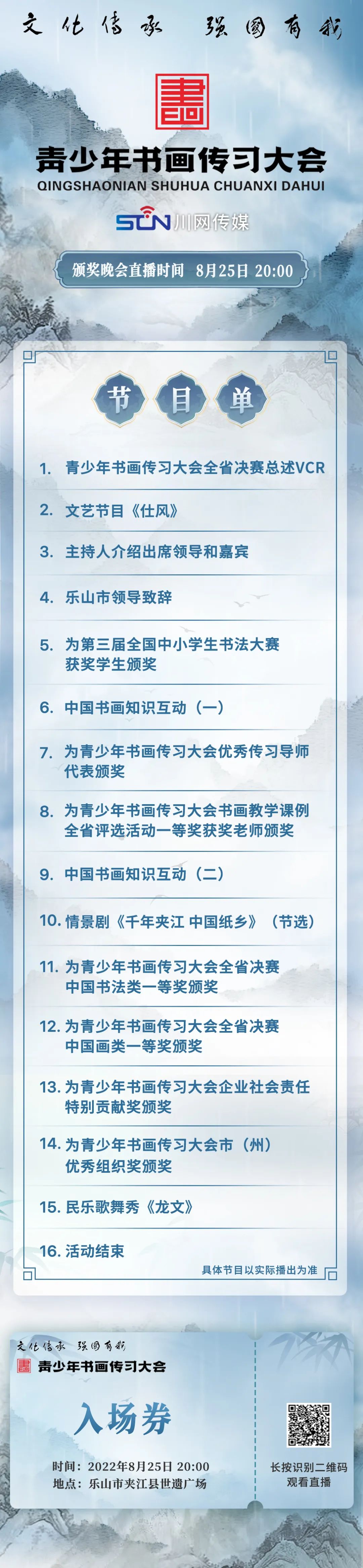 现场将展播青少年书画传习大会亮点瞬间VCR,全面回顾青少年书画传习大会全省决赛整体报名、参赛情况,决赛特色、亮点,全方位展示参赛学生对于中国传统书画喜爱,并传递书画传习过程中动人故事。
