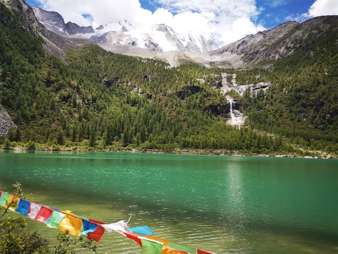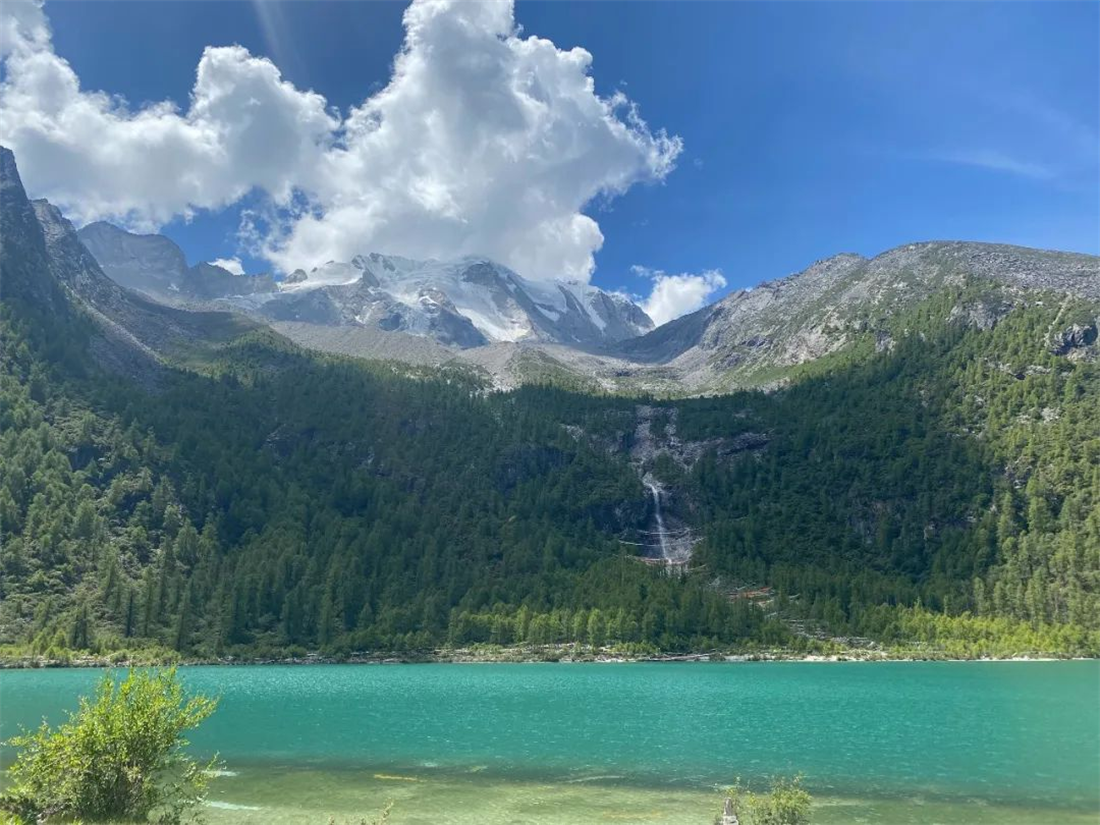 清凉的微风吹皱一池玉色的湖水,也吹去心头那些烦忧。湖面波光粼粼,雪山的倒影朦朦胧胧。
