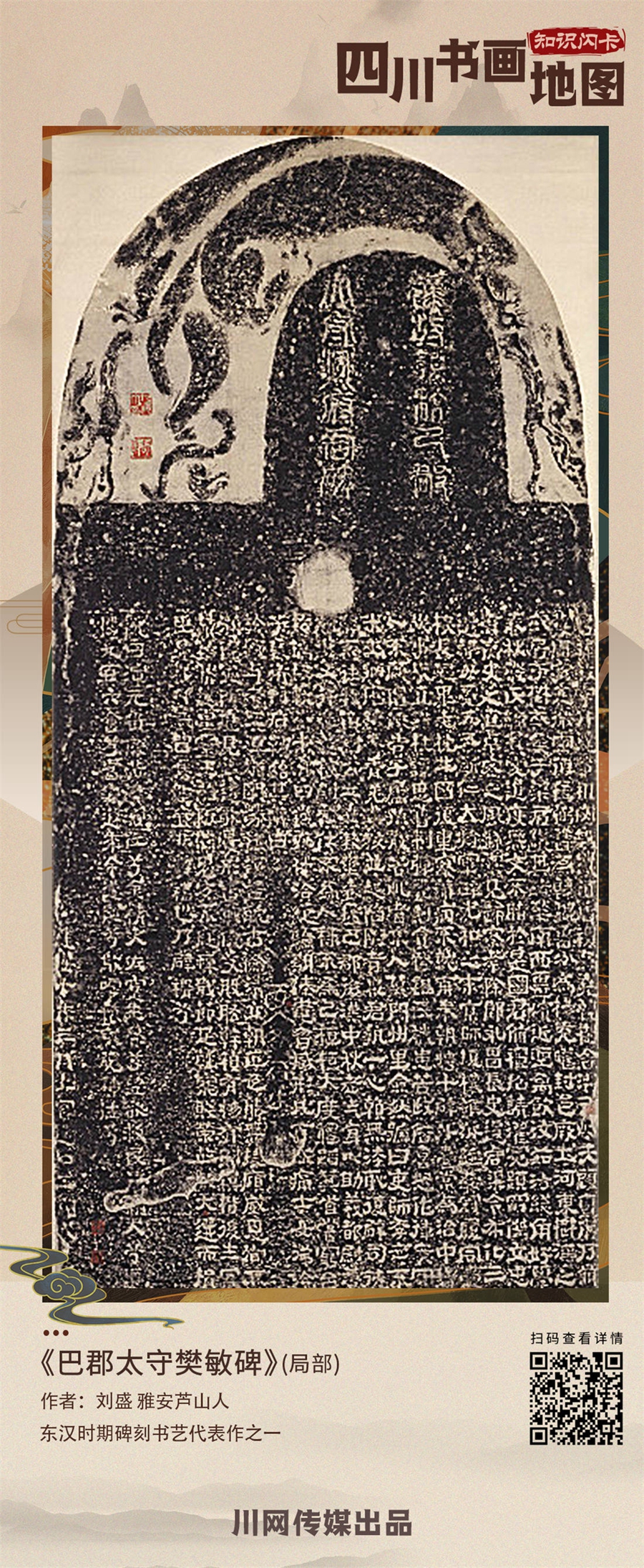 “东汉末年,碑刻书迹宏富,气象万千。《巴郡太守樊敏碑》作为方正古朴一路的代表作之一,历来受到金石学家们的推崇,成为传世汉隶名碑。”唐林介绍道,传此碑书写者为东汉末雕塑家刘盛。他的石刻艺术雄浑大气,粗犷生动,神形兼备,构思独到,尽展汉代精湛的工艺技巧。