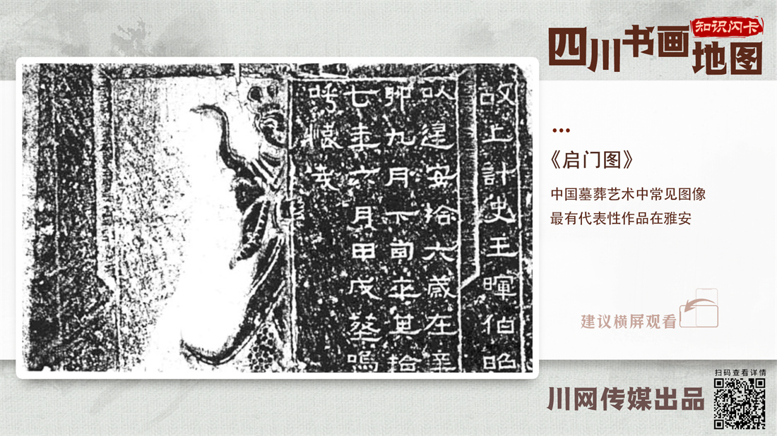 “‘启门’是中国墓葬艺术中的一个常见图像,表现的是人类希望打开一扇现实世界和神话世界之间对话之门的意境。”唐林谈到,“启门”题材中最有代表性的作品当数现藏雅安市芦山县博物馆的王晖石棺。