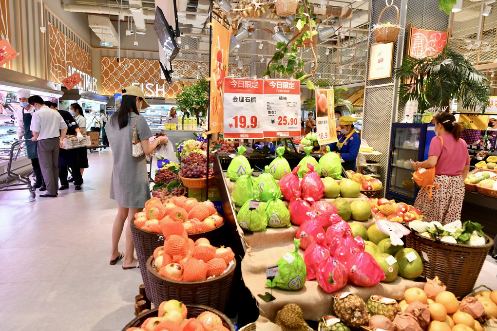 位于交子大道的伊藤金融城店内,各个区域货架上肉、蛋、奶、水果等货品充足。店长李玲介绍,该店当天送货两次,主要以蔬菜、蛋和冷冻食品为主,货物总量有2吨左右。
