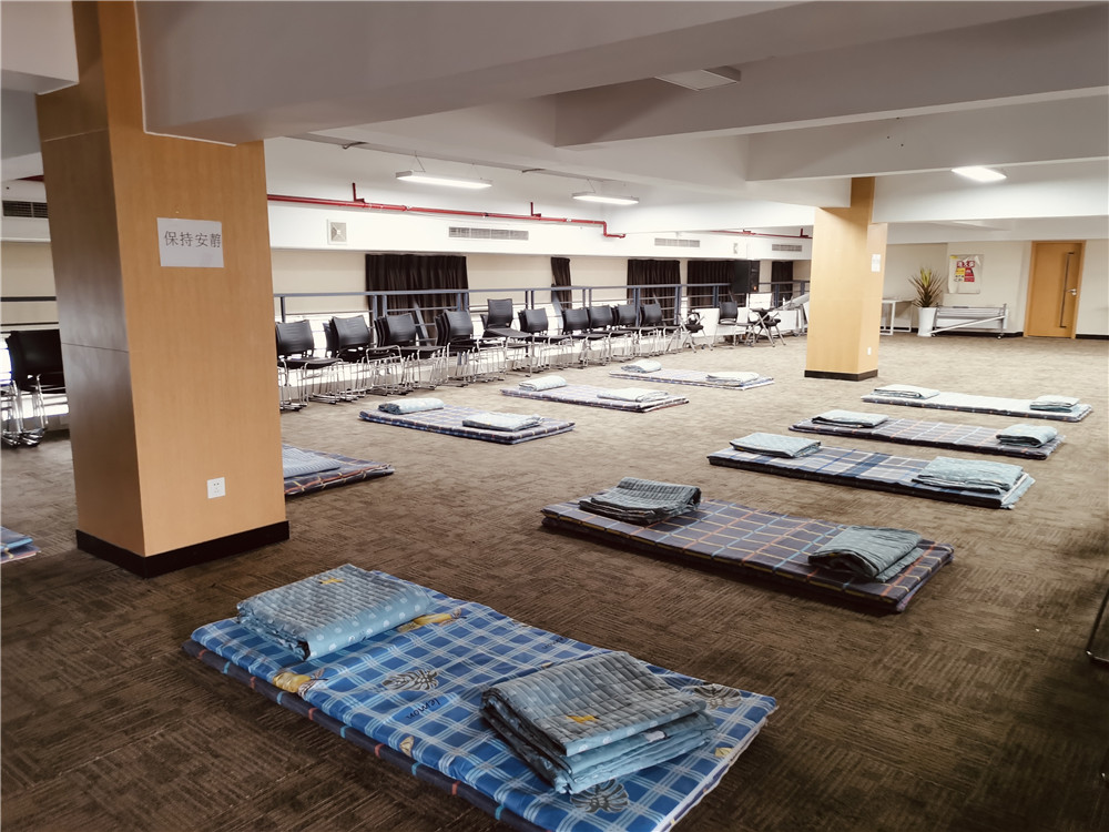 疫情期间,市场进一步加强了疫情防控举措,为了确保市场正常运营,同样进行了闭环管理,市场员工和重要商户都住在了市场。公司酒店让给了保供商户住, 60间房每天都住满了人,而公司的200余名员工则只有在市场内办公区域张起了各式各样的“床”。