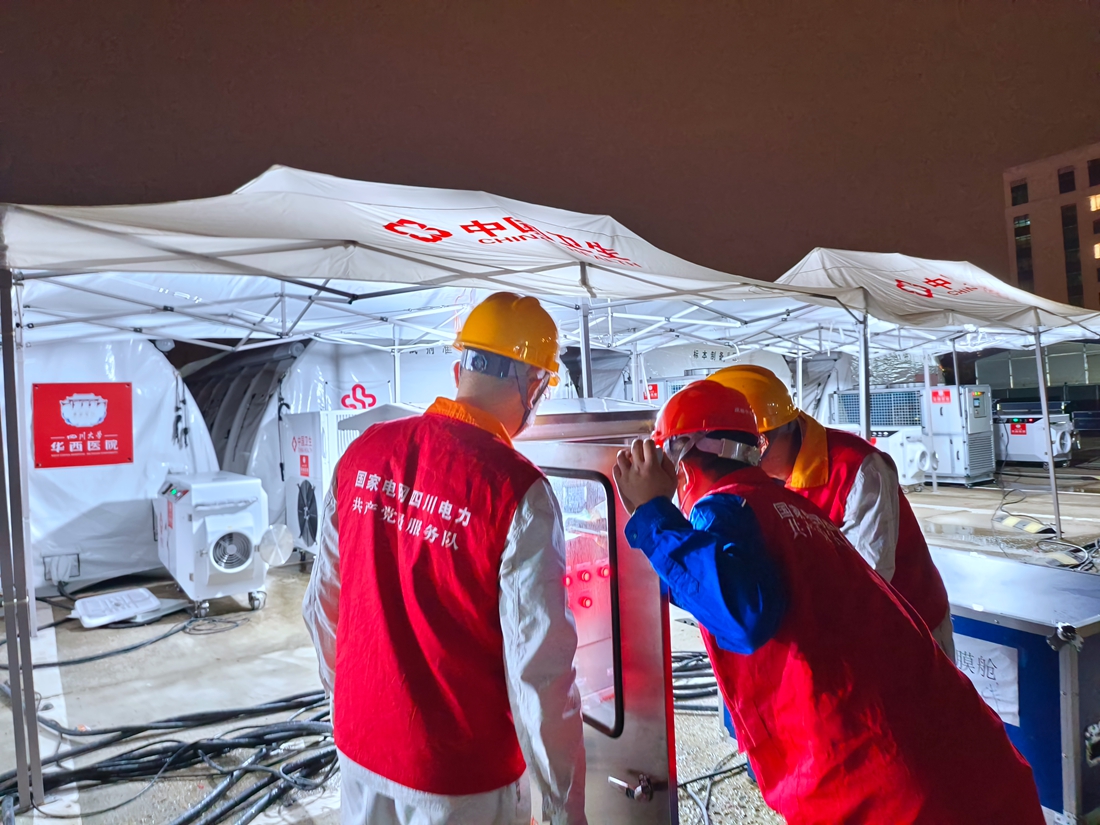 国网四川电力(成都温江)连心桥共产党员服务队为华西医院温江院区紧急搭建第二个气膜舱实验室临时电源