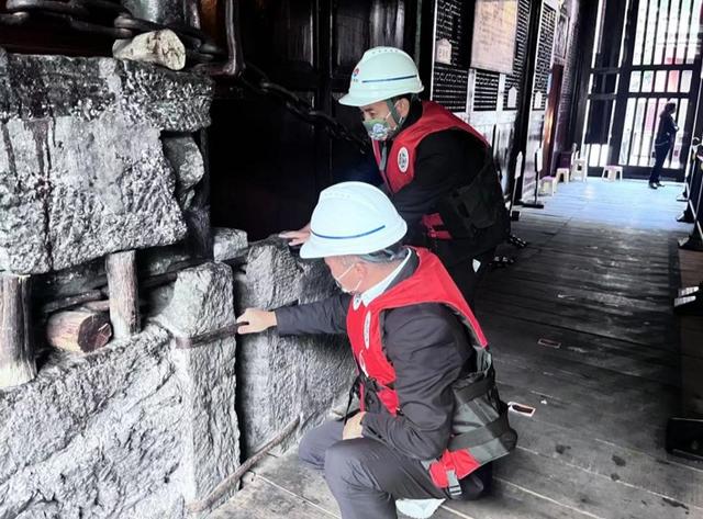 泸定桥景区员工对地震后的桥头基建进行检查。四川能投供图