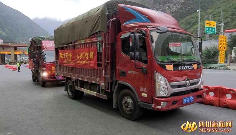 康定:沿线物资运送车辆集结驰援泸定